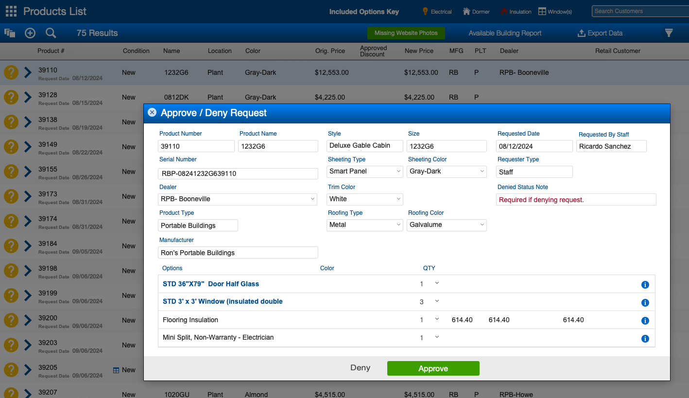 - Enhanced the product approval process by introducing a card window for requests. Users with product approval authority can now click the yellow ? status icon in the product list view to open a card window displaying all product fields for review. This allows for editing, approval, or denial without losing the list of requests, enabling quicker and more efficient approval processing.