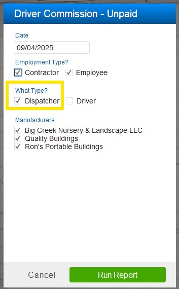 Driver Commission - Unpaid: You can now run a Dispatcher Commission Report within the Driver Commission - Unpaid report. This feature was added with the recent update that enables dispatcher commission payments.