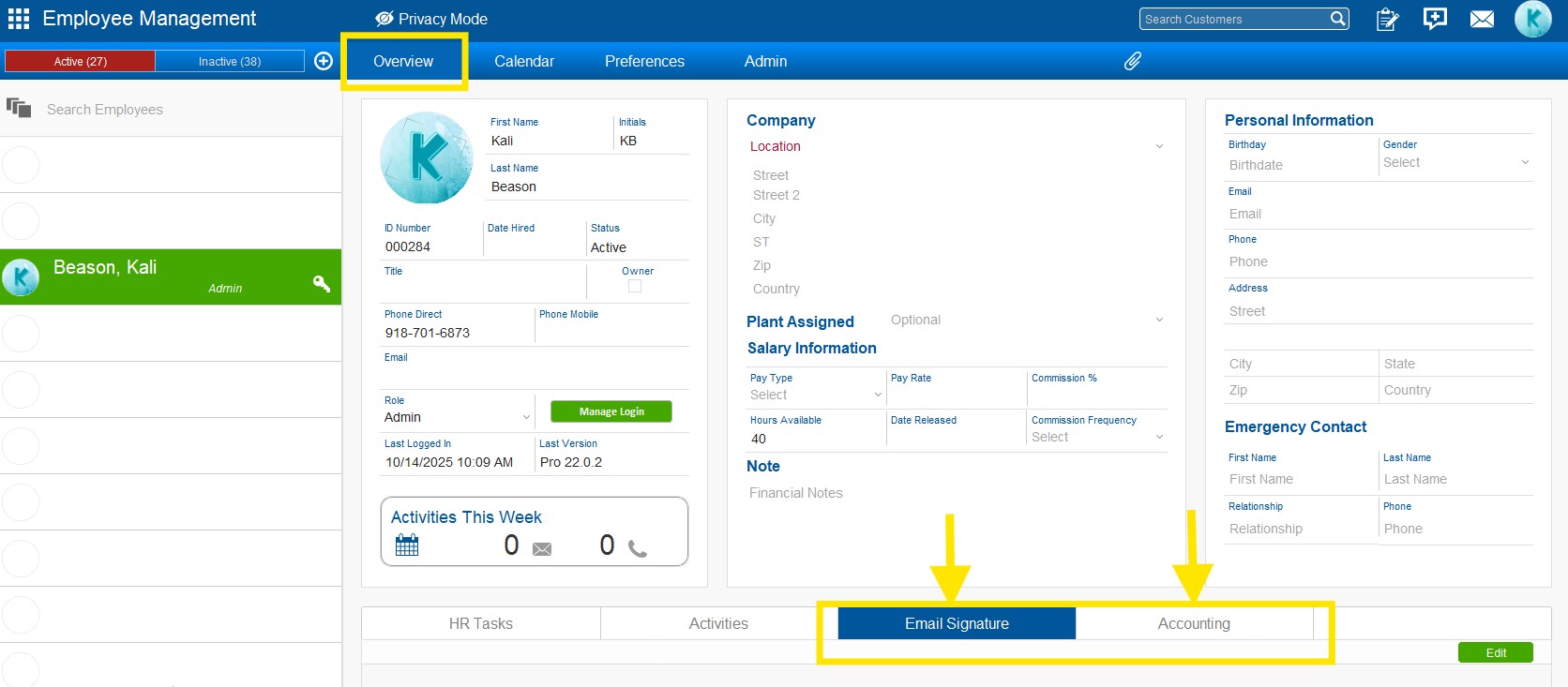 The Email Signature setting has been moved from the Preferences Panel to the Overview Panel. The Accounting button, located to the right of the Email Signature, now allows you to pay employees through QuickBooks, just like in Dealer Management. The setup process remains the same.