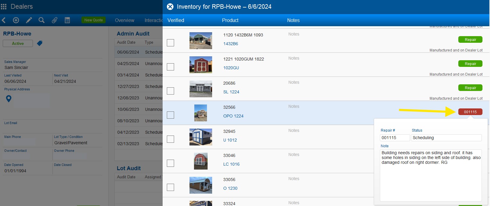 When performing a dealer audit, you can now see buildings that have an open repair record. The repair button will appear in red and display the repair number. Clicking on the repair number will open a popover showing the repair details.