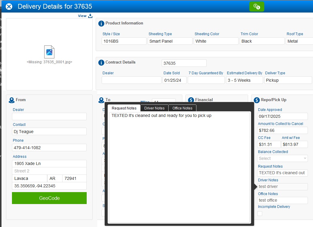Drivers can now view both Request Notes and Driver Notes on pickup deliveries. Admins and dispatchers have access to all three note types — Driver Notes, Request Notes, and Office Notes.