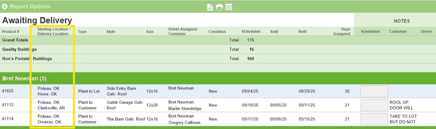 2. Awaiting Delivery Report: The Delivery Location has been added to the report and now appears in the column directly under the Starting Location.