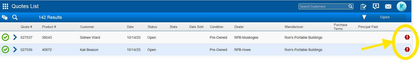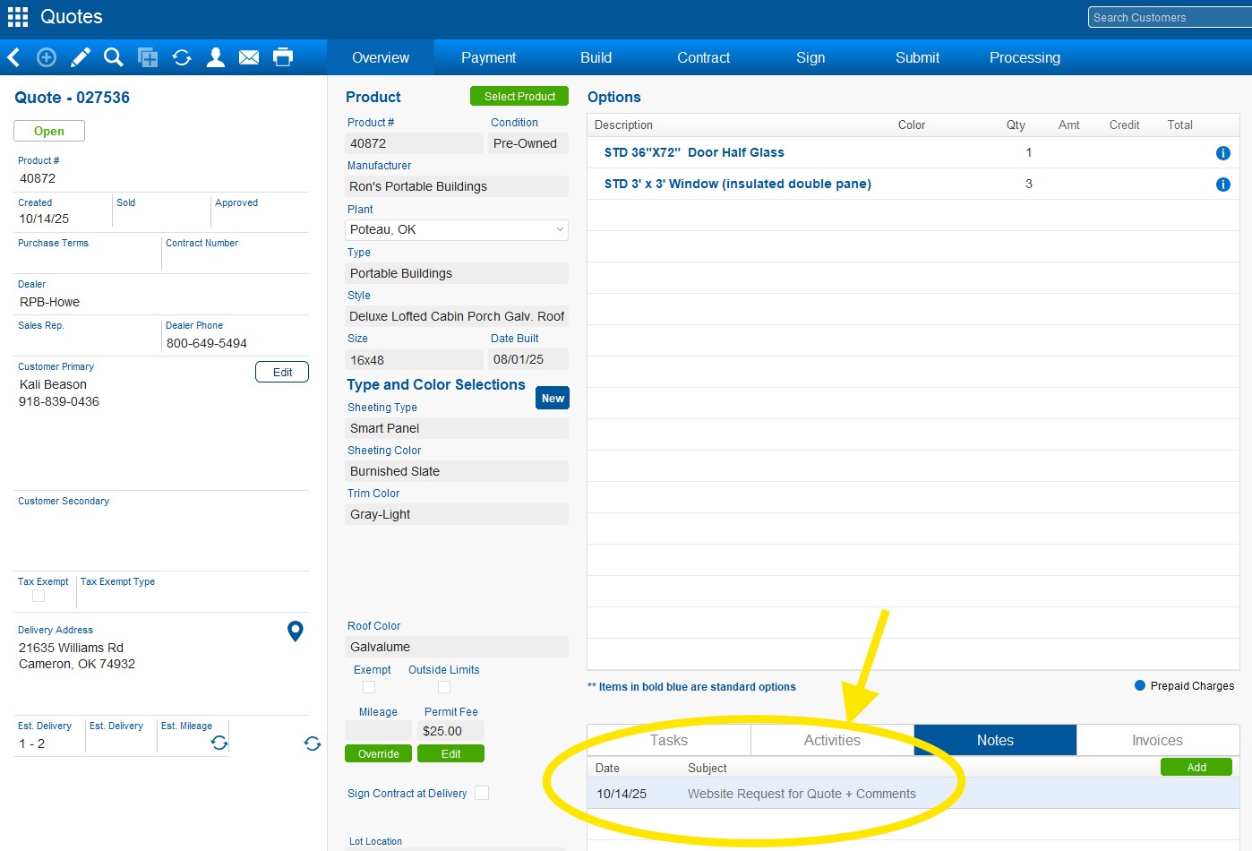 Leads can now be assigned directly to a specific dealer. When a lead is assigned, the dealer will receive an email notification and will be able to view it in their Leads List. Dealers can then review and manage their assigned leads from that list. A red exclamation point will appear on quotes originating from the website, and related notes will be visible in the Notes section of the quote.
