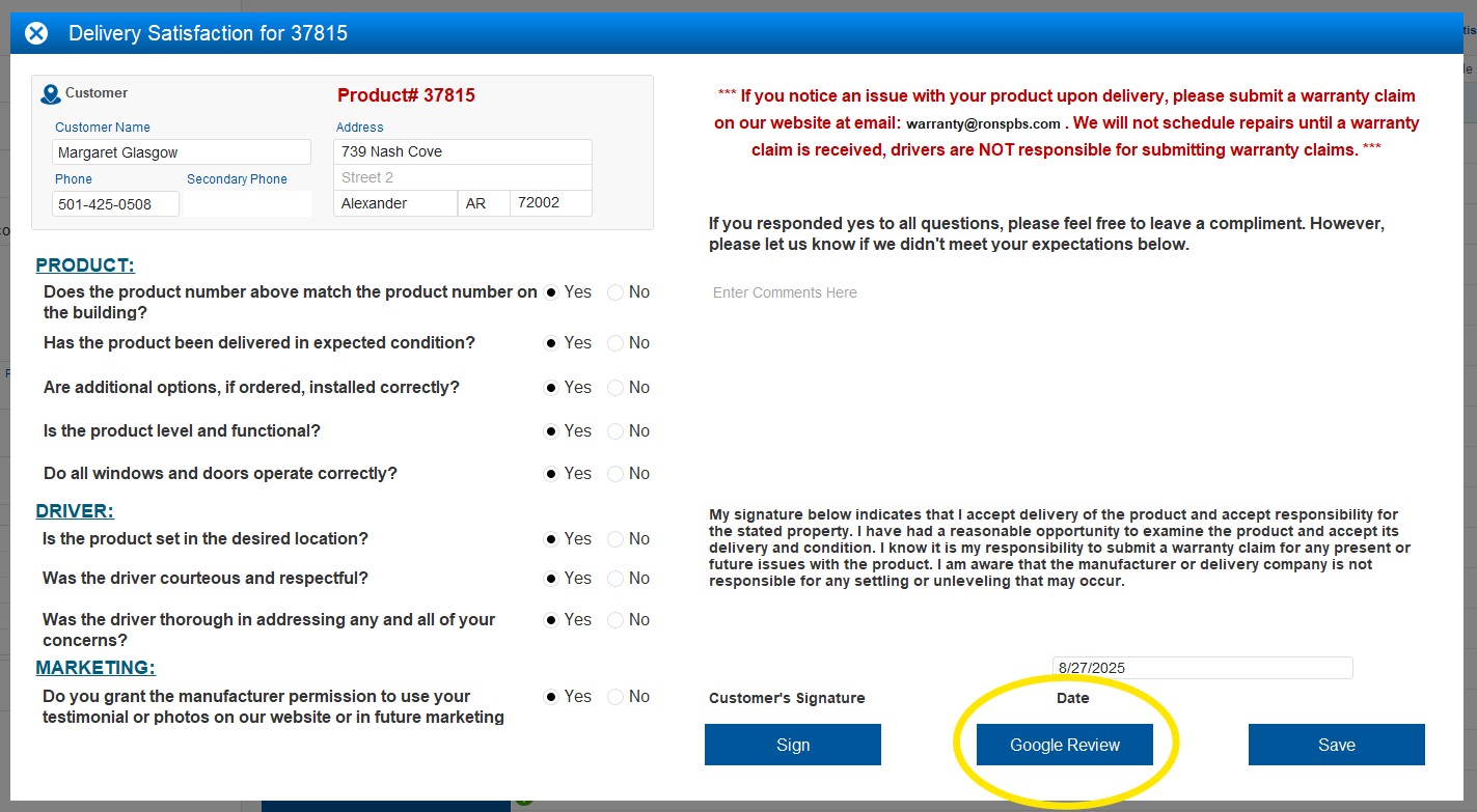 1. *Change* The location of the Google Review button has been moved from within the Delivery Liability layout to the Satisfaction Sheet layout. The button’s function remains the same.