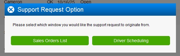 *FIX* A fix has been implemented to allow support tickets to be submitted directly from Driver Scheduling. When you have the Driver Scheduling screen open and need to submit a support ticket, the system will now prompt you to select which layout you’d like the ticket to be submitted from.